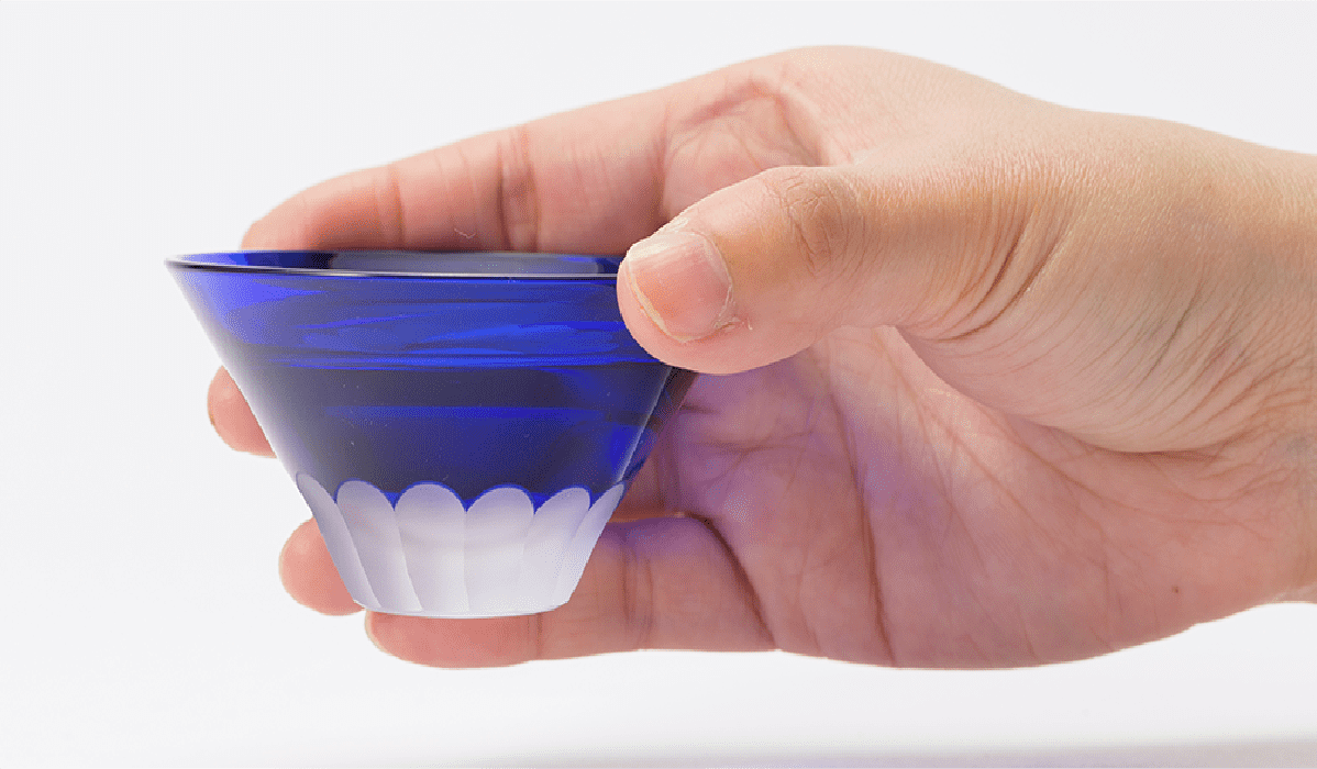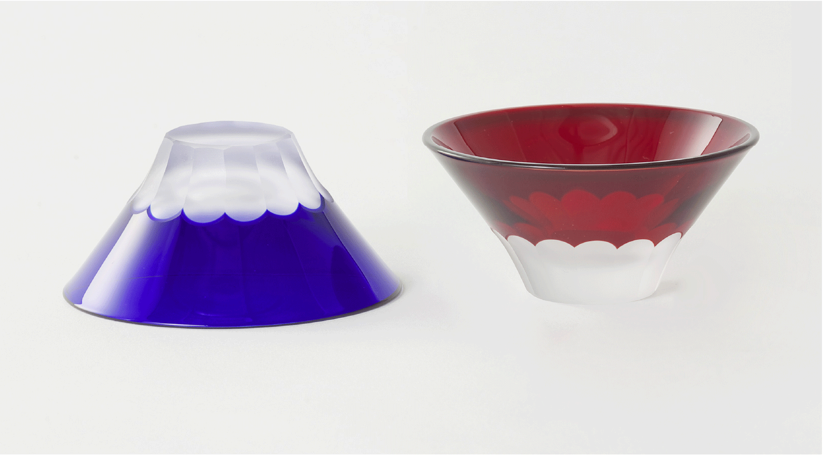 江戸切子の伝統技法でつくられた富士山の盃。透明の硝子を型吹きし、切子特有の瑠璃色(青)と紅色(赤)の硝子を重ねて吹くことでつくる「被せ硝子」に、蒲鉾彫りを施し富士にかかる雪を表現しました。